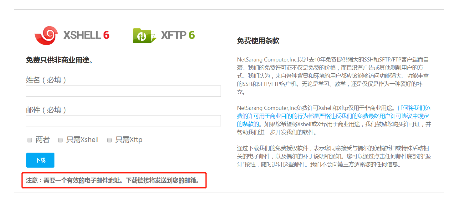 - Xshell 需要填写邮箱,后续下载链接会通过邮件形式发送