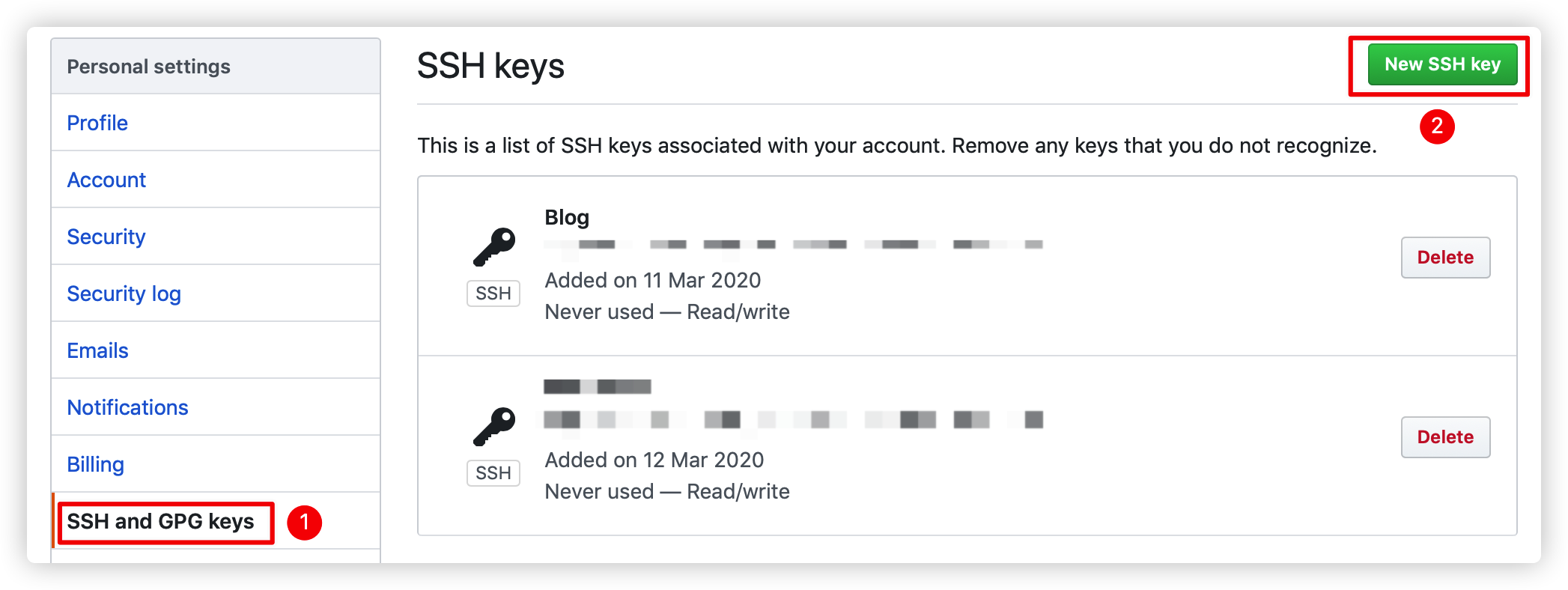 为了方便运行 GitHub Actions 时登录 GitHub 账号,我们使用 SSH 方式登录,就是要把设备的私钥交给 GitHub Actions,公钥交给 GitHub,需要我们去 Settings 里去配置。