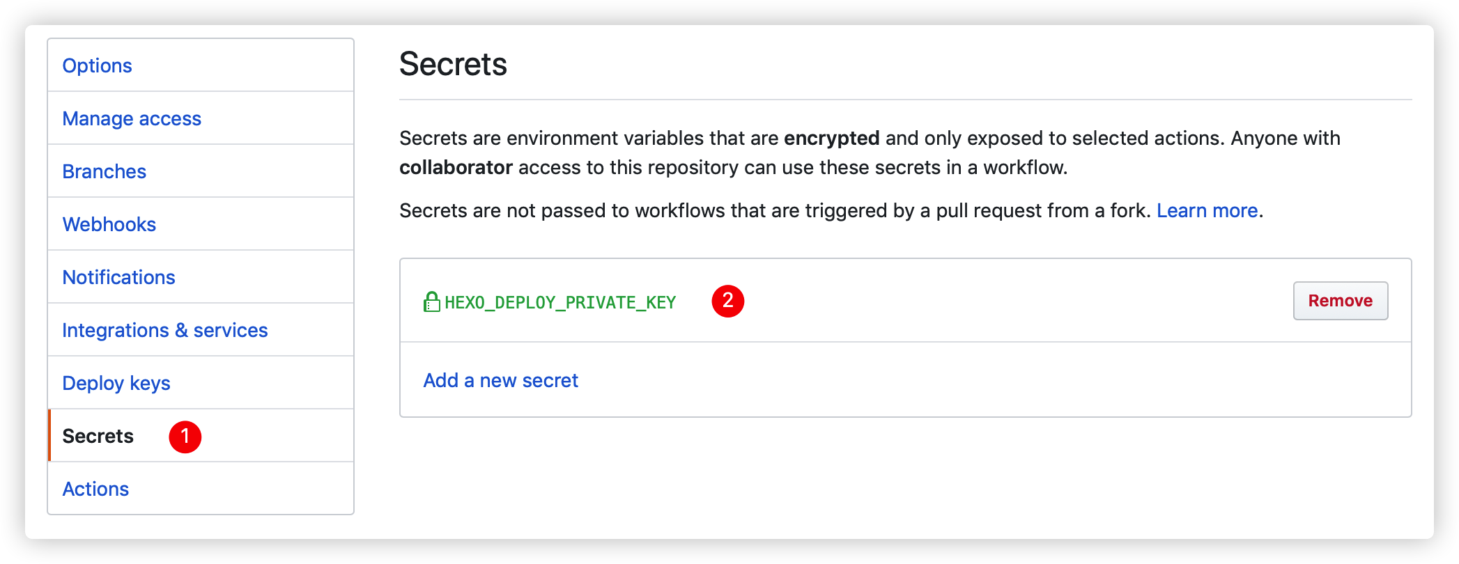 HEXO_DEPLOY_PRIVATE_KEY的密钥,将本地文本复制进去。![]()